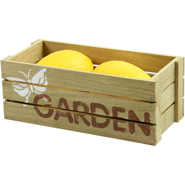Aufbewahrungskiste aus hellem Holz im "Apfelkisten-Design".