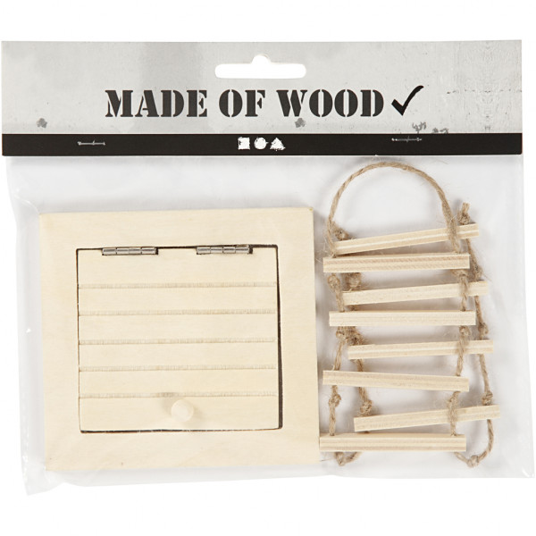 Detailed attic acces door in light wood with ball grip and open/close function. Including rope ladder.