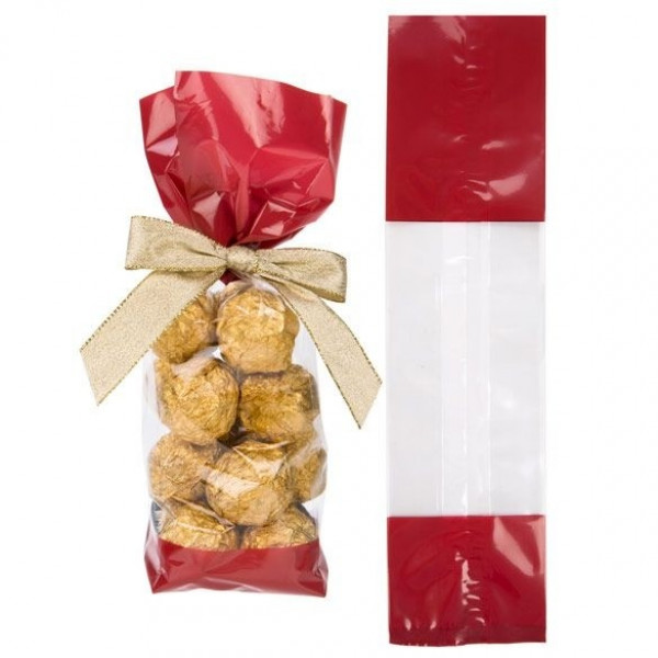 The G2RD printed side gusset bag has a red top and bottom to add a hint of glamour. This laminated bag measures 67 x 48 x 273 mm and is an excellent choice for holiday and romantic gifts like artisan chocolates, popcorn, Biscotti, chocolate-dipped pretzels, candy, and more. Side gussets expand for bulkier products and the bottom is sealed for added strength, making this a versatile option for a variety of products. The material is 40 micron thick and made from high clarity plastic film. The middle section of this bag is transparent to allow your product to be seen. Ribbons, bows, and twist ties can be used to accessorize and seal the bag. For a tamper-proof closure, this bag is also heat sealable.