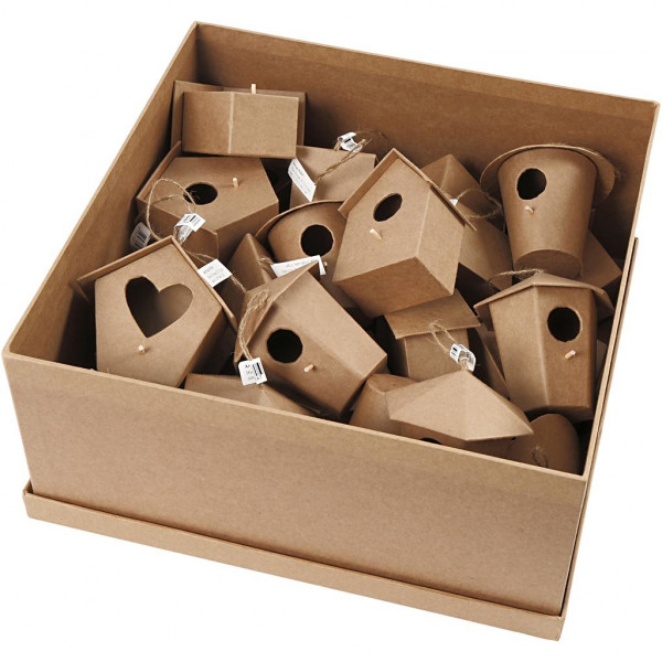Sortiment von versch. Vogelhäuschen aus braunem Pappmaché.