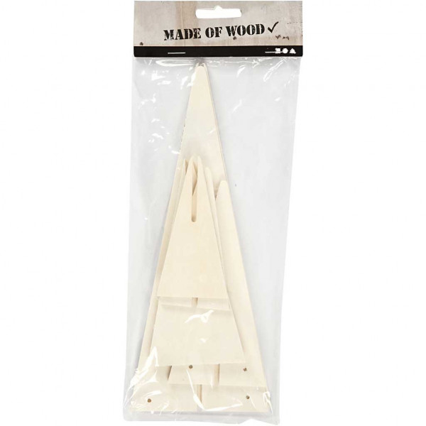 3D-Weihnachtsbaum in zwei Teilen aus hellem Holz - zum Aufstellen oder (mit Loch) zum Aufhängen. Packung mit 3 Größen.