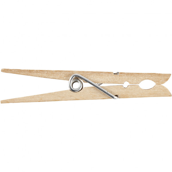 Große Wäscheklammer aus Holz mit Metallspirale.