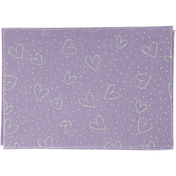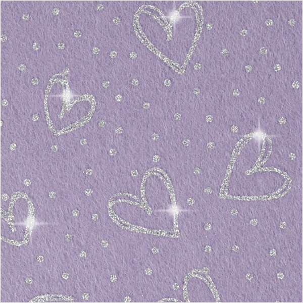 Bastelfilz, A4 21x30 cm, Stärke: 1 mm, Lila, Herzen und Punkte aus Silberglitter, 10Bl. [HOB-45387]