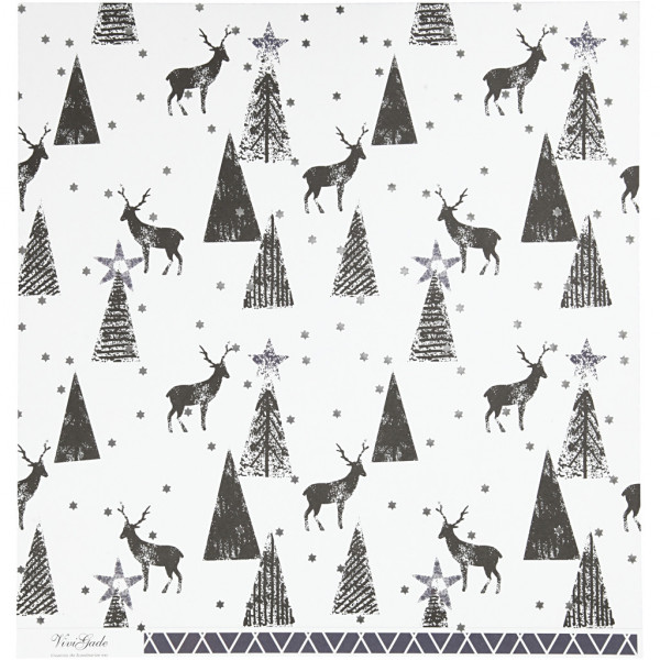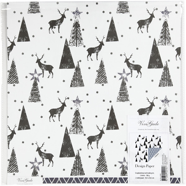Design-Papier, Blatt 30,5x30,5 cm, 180 g, Weiß, Silber, Schwarz, Sternmuster / Hirsche, 3Bl. [HOB-22509]