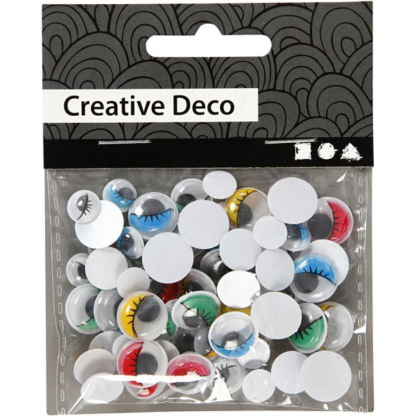 Sortiment von farbigen Wackelaugen zum Aufkleben mit flacher Rückseite und beweglichen Pupillen in versch. Größen.