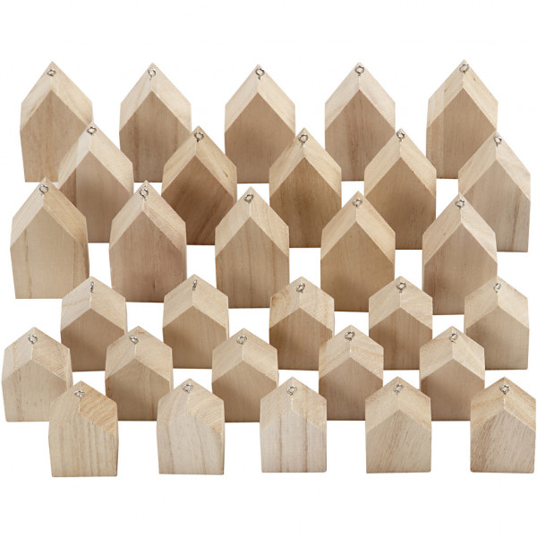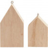 Kleine Häuser aus hellem Holz mit kleiner Metallöse zum Aufhängen.