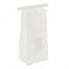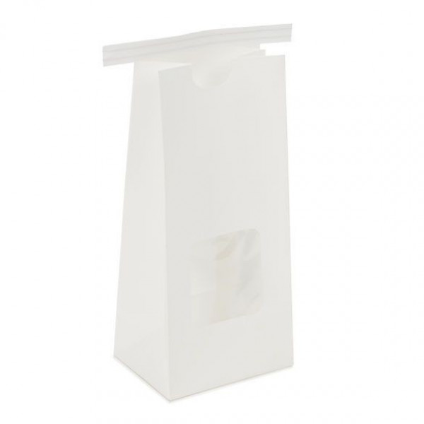 Tie Tin Window Bags offer a short-term packaging solution for takeaway products. TTW2W is our Tie Tin Window Bag in White Kraft and it measures 108 x 64 x 267 mm. A clear poly window gives your customers a peek at what's inside. Ideal for coffee, dry soup and rice mixes, candy, cookies, and more. This bag has a flat bottom base and stands upright for filling of bulk items. The poly vapor lining keeps out air and moisture, so your products stay fresh. Products with high-fat or butter content may need a higher barrier. The attached tin tie closure allows customers to reseal the bag as needed. This White Kraft package is easy to customize with added labels or a printed design.