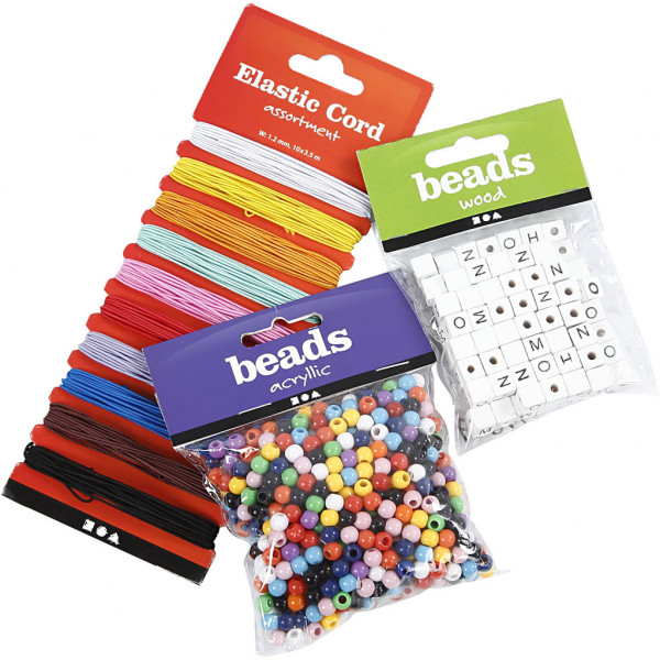 Inhalt: 10 verschiedene Farben Elastikfaden à 3,5 m, 75 g Plastik-Beads und 96 sortierte Buchstabenperlen aus Holz.