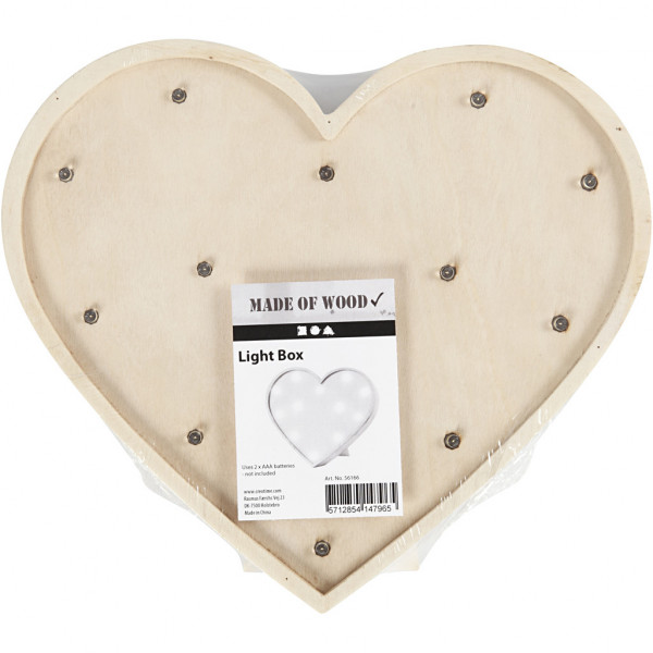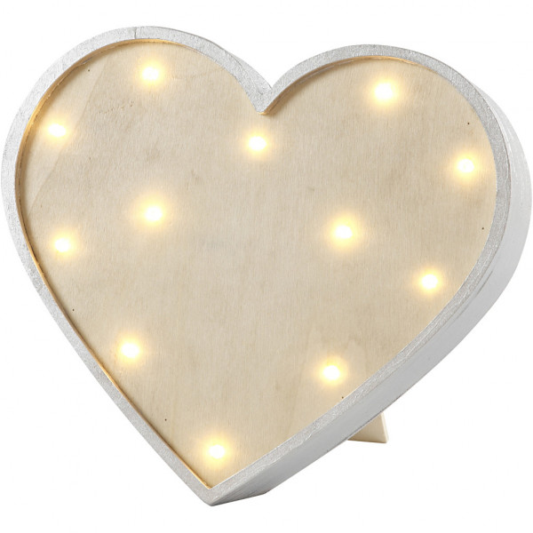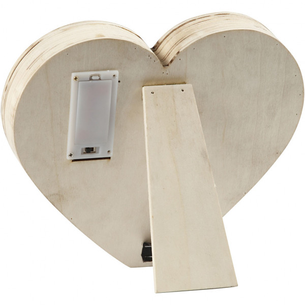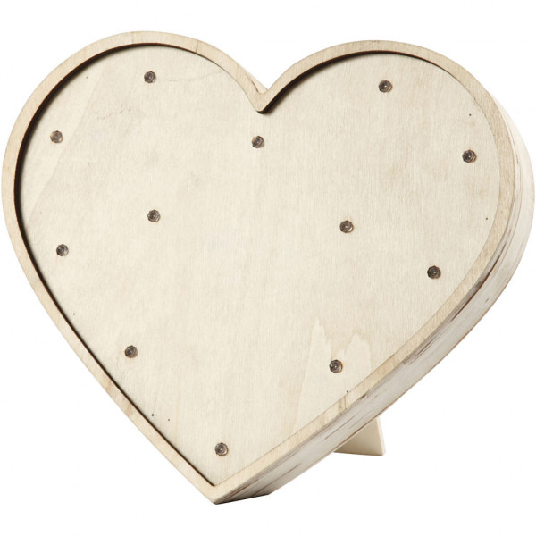 Herz aus Leichtholz mit 12 integrierten kleinen Lämpchen vorne und Aufsteller hinten.