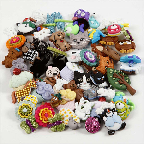 Vielseitig verwendbare Plastikknöpfe mit unterschiedlichen Motiven - mit Loch oder Öse.