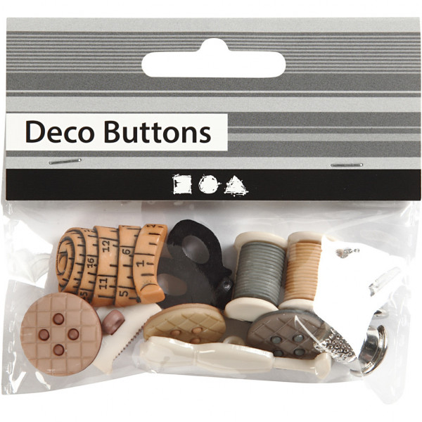 12 x sewing-themed novelty-shaped plastic buttons.