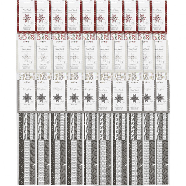 Zweidimensionale Multicolor-Papierstreifen - Design Vivi Gade - 3 Kollektionen in 4 Mustern, beidseitig bedruckt, mit Details in glänzender Metallfolie - Durchmesser = fertige Sterngröße - Anleitung beiliegend.