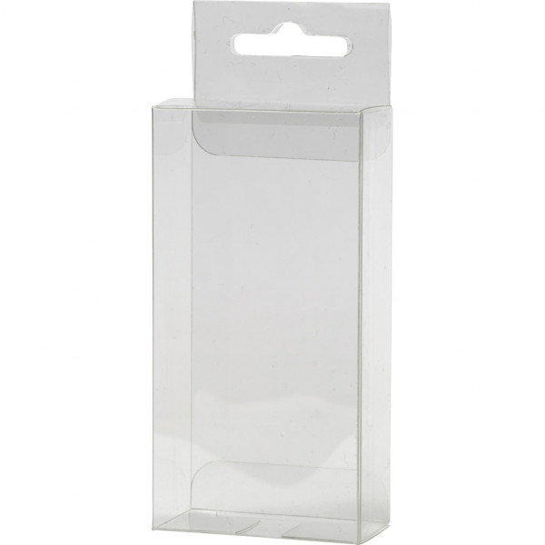 Transparente Verpackungsbox aus Kunststoff mit Eurolochung zum Aufhängen.