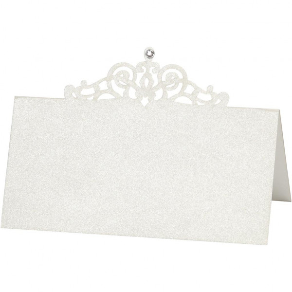 Exklusive Doppel-Tischkarten mit Perlmuttglanz, ausgestanzten Verzierungen und selbstklebendem Strass.