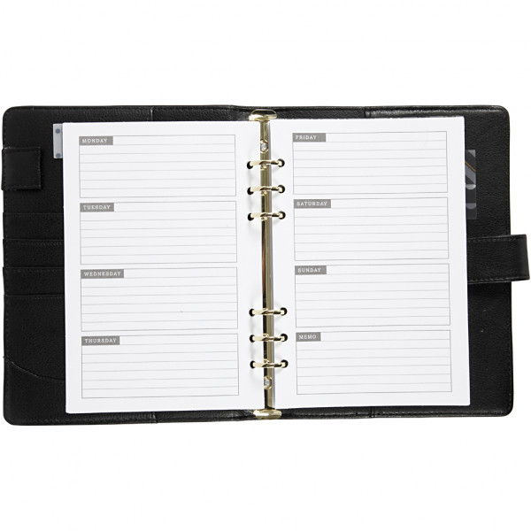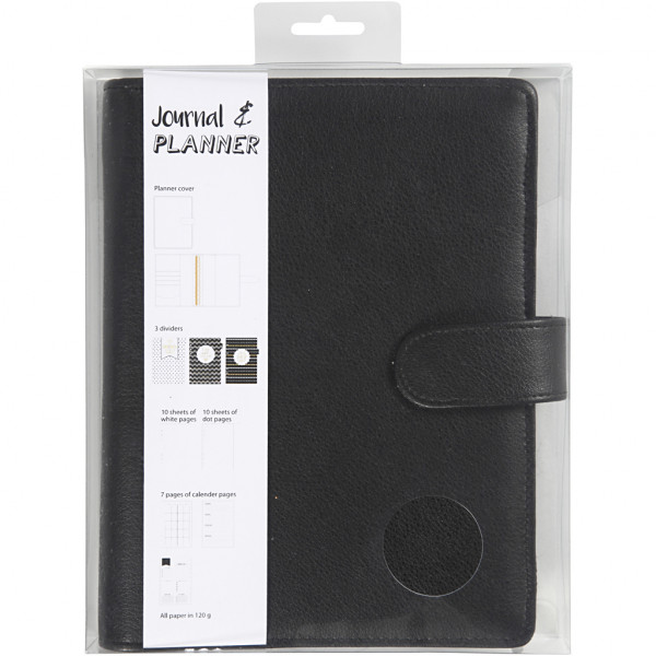Calendar cover in nice artificial leather with pushbutton closure and ring words (6 rings) for bullet paper, travelling- and creative journal. Incl. pages for notes, dots and 5-week / month's calendar.
