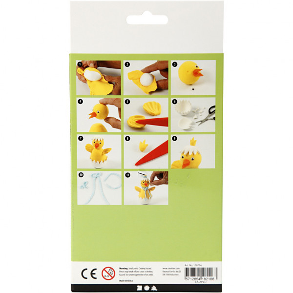 Inhalt: 2 Farben Silk Clay, 1 Farbe Foam Clay Gitter, 2 Styropor-Kugeln, Schnabel, Augen, Brille.