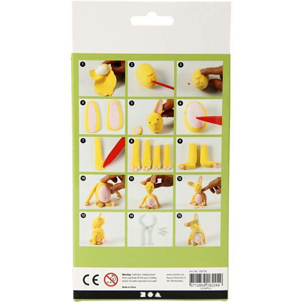 Inhalt: 2 Farben Silk Clay, 1 Farbe Foam Clay Glitter, 2 Styropor-Eier, Augen, Brille.