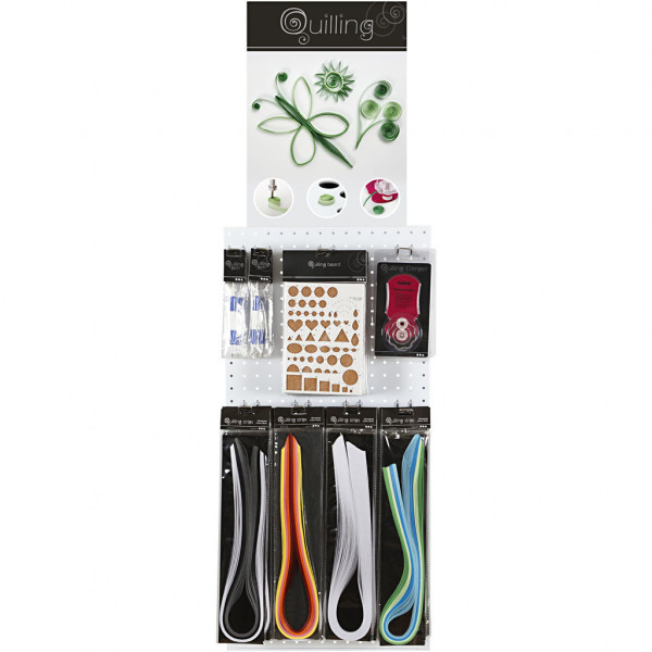 Inhalt: 10 Quilling Platten, 20 Qulling Stifte, 40 sort. Pckg. Papierstreifen und 2 Qulling Crimps.