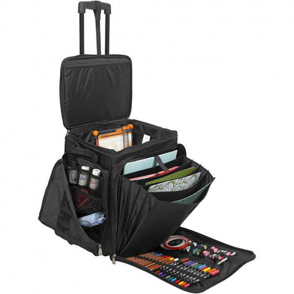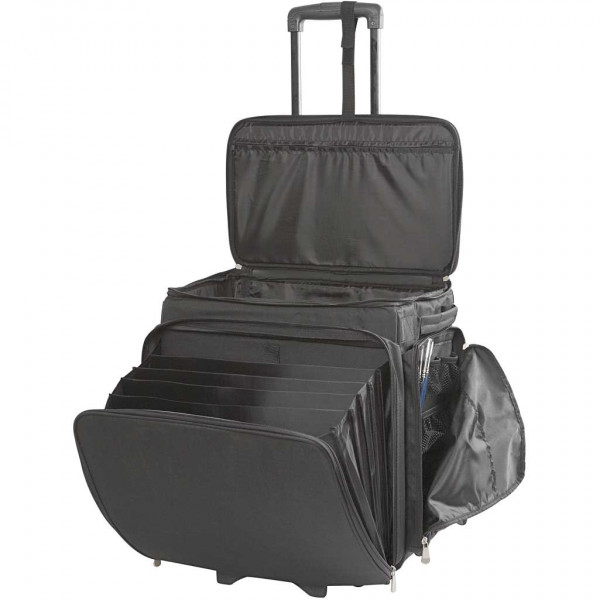 Stabiler Rollkoffer mit Teleskop-Griff - robuster Stoff mit flexiblen Fächern, Frontfach, kleinem Fach für Stifte etc. mit Reißverschlüssen.