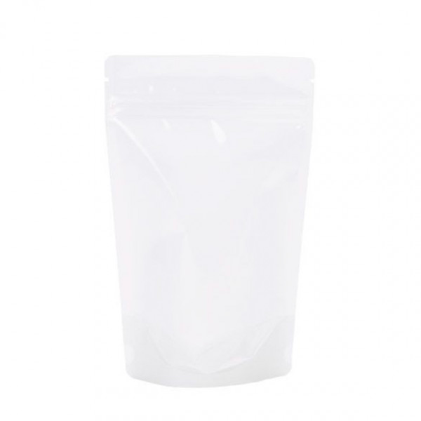 Your products are sure to stand out with the distinctive look of our white rice paper stand up pouches. ZBGR3WC measures 130 x 79 x 206 mm with inner dimensions of 121 x 64 x 171 mm. A clear front panel gives a full view of your product, while an airtight zipper closure keeps your contents fresh. This pouch holds about 4oz/113g and is ideal for dry goods. Products like candy, nuts, and powdered mixes are a great fit for this unique pouch. Laminated for extra strength and durability, the material is 125 micron thick and food safe. When filled with product, this pouch stands up on its own, making it visually appealing on store shelves. The attractive rice paper offers a unique fiber pattern for a textured, high-end look.
