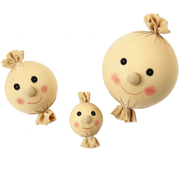 Mit Stoff bekleidete Kugel mit gemaltem Gesicht und Nase.
