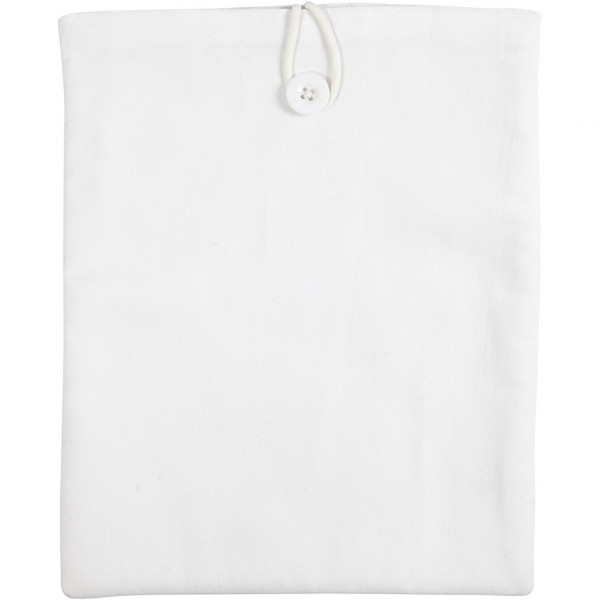 Practical cover for tablets and iPads of 100% cotton. The cover is lined and has button and tie closure at the top.