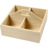 Schild aus hellem Holz mit Metallhalterung auf der Rückseite.
