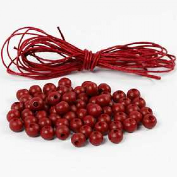 Holzperlen und Baumwollschnur, D: 8 mm, Stärke: 3 mm, Rot, 1Set [HOB-25240]